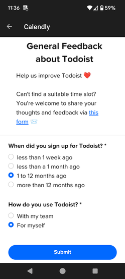 I really like how Todoist does feedback sessions. They don't pay, but it is displayed under "support". And they use a lot of segmentation with Calendly. Only a 15-minute call is less commitment and they also offer an async option if you're not interested. Call option wouldn't show up for free users.